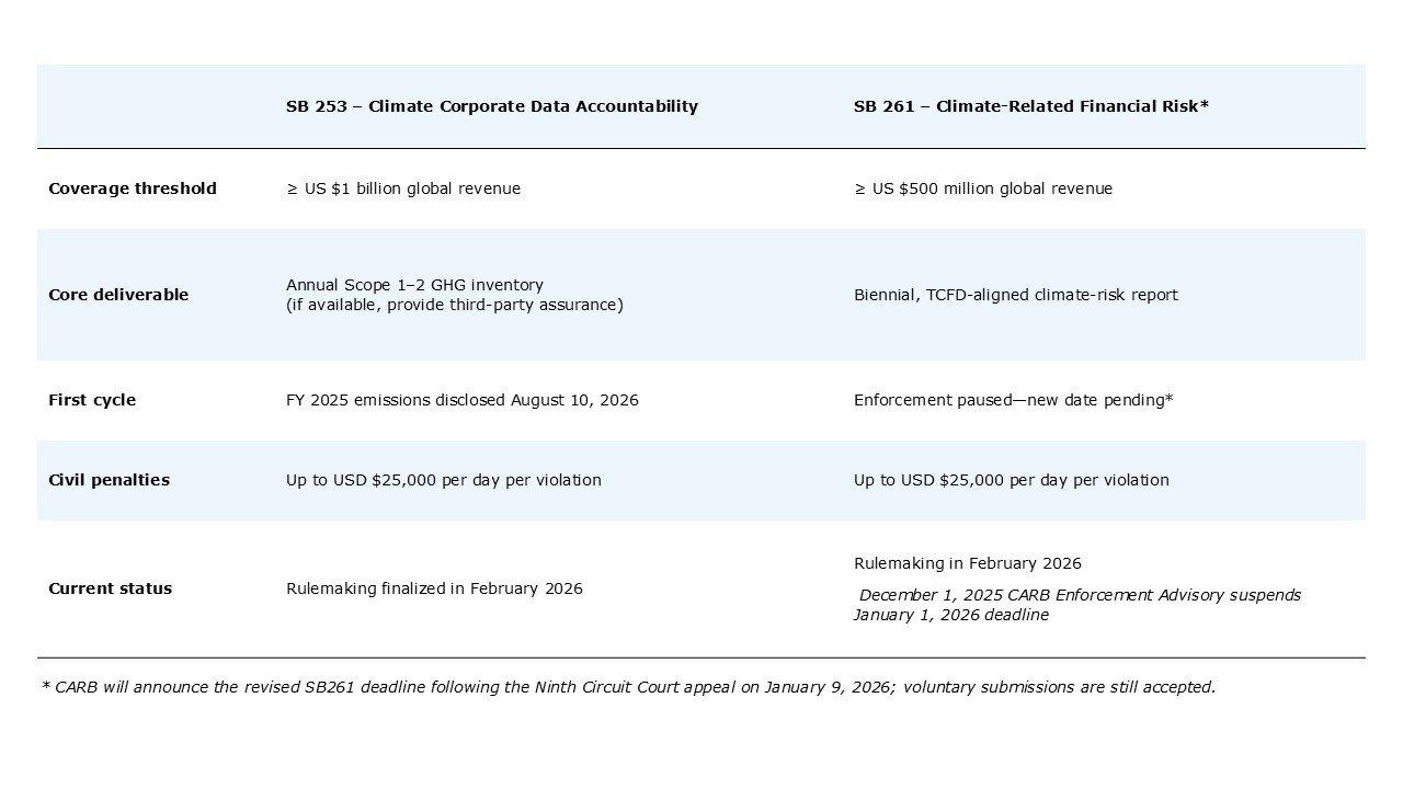 On December 9, CARB released draft implementing regulations for SB 253 and SB 261 and announced a public hearing to consider adopting regulations on February 26, 2026. The 45 day public comment period will start Dec 26, 2025 and end February 9, 2026.